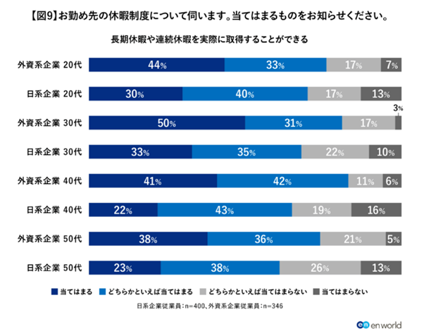 一般的に、外資系企業は日本企業に比べて、有給取得率が高くなる傾向にあります。業務に支障なく結果を出せている場合は、定時退社や長期休暇などを取得しやすいでしょう。