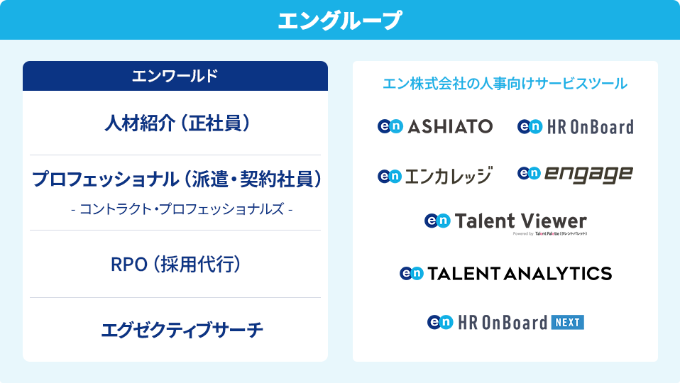 トータル・タレント・ソリューション ソリューションを構成する、エンワールドの4つのサービスとエン株式会社による人事担当者向けサービスツールを紹介します。