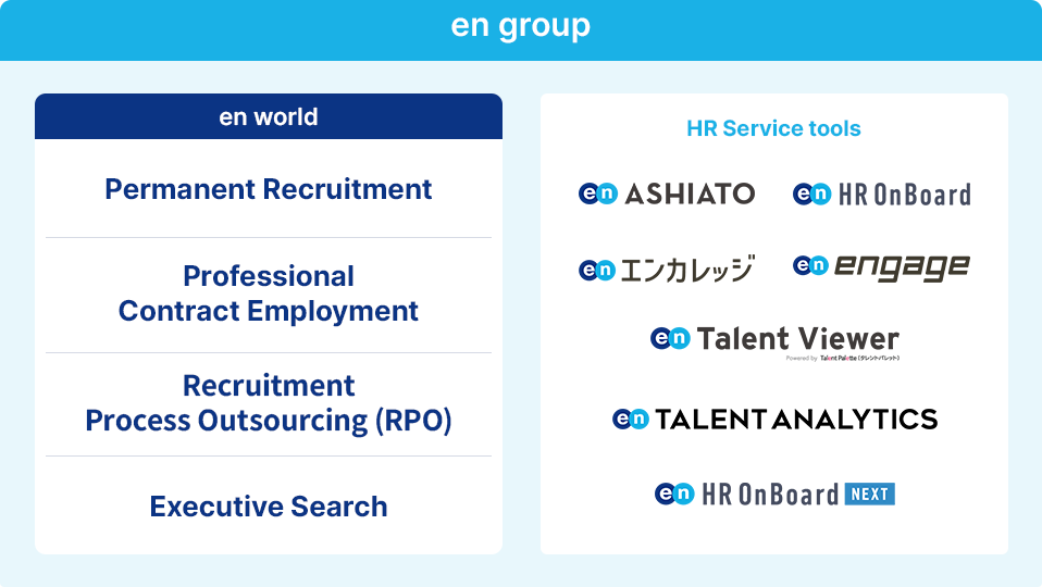 Total Talent Solutions This page introduces the four services of en world and the service tools for HR professionals by en Inc. that configure the solution.